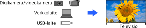Valokuva, jonka tarkkuus on 4K tai parempi, voidaan näyttää 4K-tarkkuudella (3 840×2 160). Voit liittää HDMI 4K -lähtöä tukevan digikameran/videokameran television HDMI IN -liitäntään kameraan tallennettujen teräväpiirtokuvien näyttämiseksi. Voit myös näyttää liitetyille USB-laitteille ja kotiverkkoosi tallennettuja teräväpiirtokuvia.