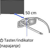 Kada prvi put koristite aktivne 3D naočare, držite naočare u opsegu od 50 cm od TV-a, uključite TV, a zatim pritisnite i držite taster/indikator (napajanje)