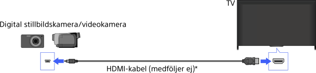 Anslut din digitala stillbildskamera eller videokamera från Sony med en HDMI-kabel. Använd en kabel som har en HDMI-minikontakt (uttag) i änden som ansluts till den digitala stillbildskameran/videokameran och en standard HDMI-kontakt (uttag) som ansluts till TV:n.