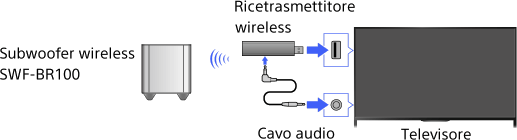 Collegare il ricetrasmettitore wireless in dotazione con il subwoofer wireless SWF-BR100 per utilizzare il subwoofer wireless.