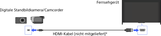 Schließen Sie Ihre digitale Standbildkamera oder Ihren Camcorder von Sony über ein HDMI-Kabel an. Verwenden Sie ein Kabel mit einer HDMI-Minibuchse zum Anschließen an die digitale Standbildkamera bzw. den Camcorder und einer HDMI-Standardbuchse zum Anschließen an das Fernsehgerät.