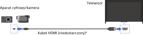 Podłącz swój aparat cyfrowy lub kamerę Sony za pomocą kabla HDMI. Użyj kabla wyposażonego w złącze (gniazdo) mini jack HDMI po stronie aparatu/kamery i standardowe złącze (gniazdo) HDMI po stronie telewizora.
