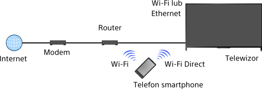 • Możesz również podłączyć aplikację „TV SideView” do telewizora, korzystając z opcji Wi-Fi Direct. Włącz funkcję Wi-Fi Direct w telewizorze, wybierając opcje [Ustawienia] → [Sieć] → [Wi-Fi Direct] → [Wł.], a następnie przejdź do strony [Ustawienia Wi-Fi Direct] w telewizorze, wybierając opcje [Ustawienia] → [Sieć] → [Ustawienia Wi-Fi Direct].