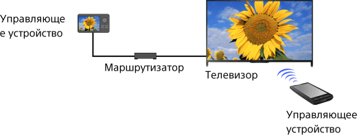 Включив функцию renderer, можно воспроизвести фотографии/музыку/видео с управляющего устройства (например, цифровой фотокамеры) на экране телевизора, управляя непосредственно устройством. Кроме того, можно использовать мобильное устройство (например, смартфон) в качестве пульта ДУ телевизором по домашней сети.