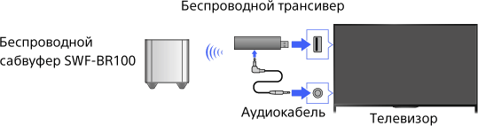 Подключите беспроводной трансивер, прилагаемый к беспроводному сабвуферу SWF-BR100, для использования беспроводного сабвуфера.