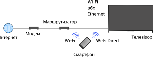 • Також можна підключити прикладну програму «TV SideView» до телевізора за допомогою функції Wi-Fi Direct. Щоб увімкнути на телевізорі функцію Wi-Fi Direct, виберіть [Налаштування] → [Мережа] → [Wi-Fi Direct] → [Ввімкн] і перейдіть на сторінку [Налаштування Wi-Fi Direct], вибравши [Налаштування] → [Мережа] → [Налаштування Wi-Fi Direct].