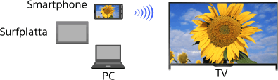 ”Skärmspegling” är en funktion för att visa skärmen för en enhet som är kompatibel med skärmspegling (t.ex. en smartphone eller dator) på TV:n med Miracast-teknik. Det behövs ingen trådlös router (accesspunkt) för denna funktion.