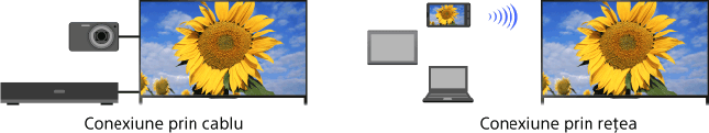 Conectaţi la televizor diferite dispozitive (de ex., echipament de înregistrare BD, cameră foto digitală, PC, telefon inteligent, tabletă). Puteţi reda conţinut precum imagini şi muzică la dispozitivul conectat.