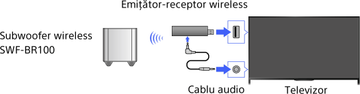 Conectaţi emiţătorul-receptor wireless furnizat cu subwoofer-ul wireless SWF-BR100 pentru a utiliza subwoofer-ul wireless.