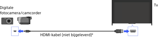 Sluit uw digitale fotocamera of camcorder van Sony aan met een HDMI-kabel. Gebruik een kabel met een HDMI-mini-aansluiting voor de zijde van de digitale fotocamera/camcorder en een standaard-HDMI-aansluiting voor de zijde van het tv-toestel.