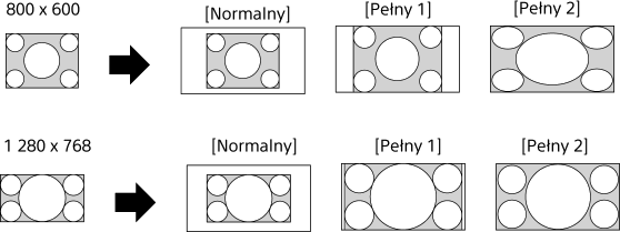 Jeśli wybrane jest wejście komponentowe (480p) i opcja [Wybór sceny] jest ustawiona na [Gra] lub [Grafika], wówczas dostępne opcje zmieniają się na [Normalny]/[Pełny]/[Konsola 1]/[Konsola 2].