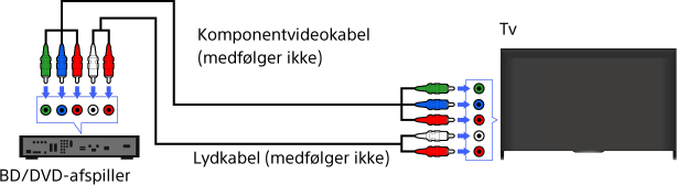 Hvis din BD/DVD-afspiller er udstyret med et komponentvideostik, skal den tilsluttes tv'et med et komponentvideokabel og et lydkabel.