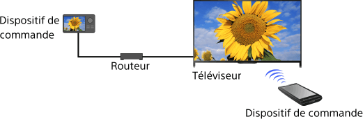 Vous pouvez activer la fonction Renderer pour lire les fichiers photo/audio/vidéo stockés dans un dispositif de commande (par exemple, dans un appareil photo numérique) sur l’écran du téléviseur en commandant directement le périphérique. Vous pouvez également utiliser un appareil mobile (par exemple, un Smartphone) comme télécommande du téléviseur via le réseau domestique.