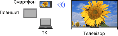 Функція «Віддзеркалення екрана» дає змогу виводити вміст екрана пристрою, що підтримує віддзеркалення екрана (смартфон, ПК тощо), на екран телевізора за допомогою технології Miracast. Для використання цієї функції бездротовий маршрутизатор (точка доступу) не потрібен.