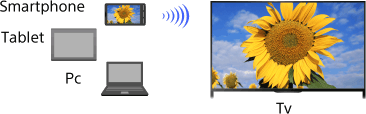 "Schermreproductie" is een functie voor het weergeven van een scherm dat geschikt is voor Schermreproductie (zoals een smartphone of pc) op het tv-toestel, door middel van Miracast-technologie. Voor deze functie is een draadloze router (toegangspunt) niet nodig.