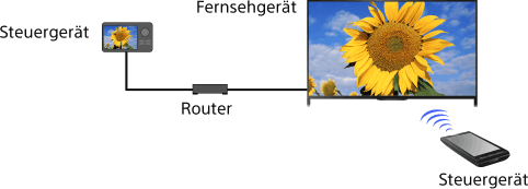 Wenn Sie die Renderer-Funktion aktivieren, können Sie Foto-/Musik-/Videodateien, die auf einem Steuergerät (z. B. einer digitalen Standbildkamera) gespeichert sind, auf dem Fernsehschirm anzeigen bzw. wiedergeben lassen und dabei das Gerät direkt bedienen. Außerdem kann ein mobiles Gerät (z. B. ein Smartphone) über das Heimnetzwerk als Fernbedienung für das Fernsehgerät fungieren.