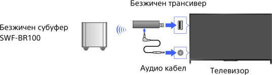 Свържете безжичния трансивер, доставен с безжичния субуфер SWF-BR100, за да използвате безжичния субуфер.