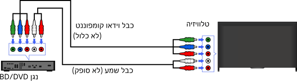 אם נגן ה-BD/DVD שלך מצויד בשקעי וידאו קומפוננט, חבר אותו אל הטלוויזיה בעזרת כבל וידאו וכבל שמע קומפוננט.