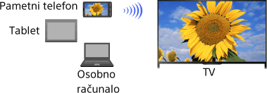 »Zrcaljenje zaslona« je funkcija za prikazivanje zaslona uređaja kompatibilnoga sa značajkom Zrcaljenje zaslona (poput pametnog telefona ili računala) na TV-u pomoću tehnologije Miracast. Bežični usmjerivač (pristupna točka) nije neophodan za korištenje ove funkcije.