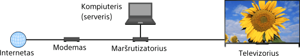 Galite atkurti nuotraukas, muziką, vaizdo įrašus, įrašytus serveryje (pvz., kompiuteryje), prijungtame prie to paties namų tinklo, prie kurio prijungtas televizorius.