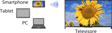 “Mirroring schermo” è una funzione che serve a visualizzare lo schermo di un dispositivo compatibile con Mirroring schermo (ad esempio uno smartphone o un PC) sul televisore tramite la tecnologia Miracast. Per utilizzare questa funzionalità non è necessario un router (o punto di accesso) wireless.
