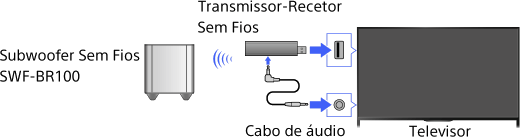 Ligue o Transmissor sem fios fornecido com o Subwoofer Sem Fios SWF-BR100 para utilizar este Subwoofer Sem Fios.