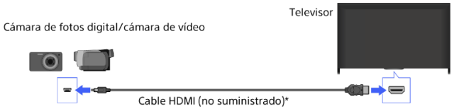 Conecte la cámara de fotos digital o la cámara de vídeo Sony con un cable HDMI. Utilice un cable que tenga una minitoma HDMI para el terminal de la cámara de fotos digital/cámara de vídeo, y una toma HDMI estándar para el terminal del televisor.