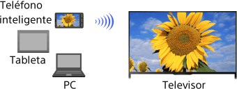 “Duplicación de pantalla” es una función que permite visualizar la pantalla de un dispositivo compatible con la función Duplicación de pantalla (como un teléfono inteligente o un PC) en el televisor mediante la tecnología Miracast. Para usar esta función no se necesita ningún enrutador inalámbrico (punto de acceso).
