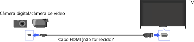 Conecte a sua câmera digital ou câmera de vídeo Sony usando um cabo HDMI. Use um cabo que possua uma minitomada HDMI para saídas de câmeras digitais/câmeras de vídeo e uma tomada HDMI padrão para a saída da TV.