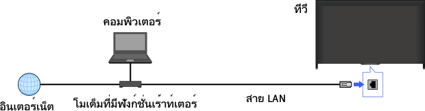 การเชื่อมต่อ LAN แบบใช้สายจะช่วยให้ท่านสามารถเข้าใช้งานอินเตอร์เน็ตและเครือข่ายที่บ้านได้ เชื่อมต่อสาย LAN เข้ากับทีวี