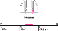 出厂前,耳机上安装的是M尺寸的耳塞。如果感觉M尺寸的耳塞不贴合您的耳朵,请将其更换为S或L尺寸的耳塞(提供)。查看耳塞内部颜色以确认其尺寸。