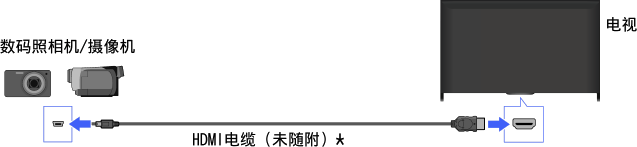 使用HDMI电缆连接Sony数码照相机或摄像机。请使用具有用于数码照相机/摄像机端的HDMI迷你插孔(插口)和用于电视机端的标准HDMI插孔(插口)的电缆。