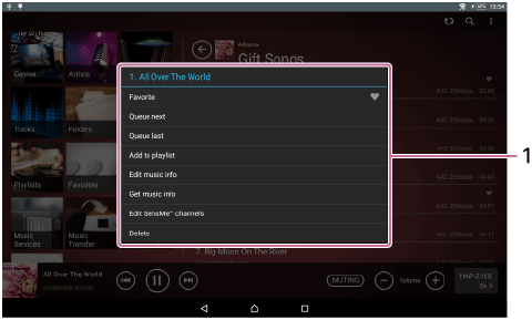 Puede agregar el elemento seleccionado a la Cola de reproducción, editar la información de la pista, etc. Los menús de contexto son distintos según el elemento que seleccione en la lista.
