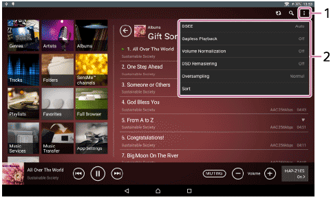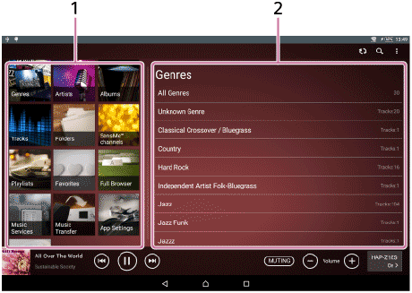 Puede utilizar las diferentes funciones de los menús de HDD Audio Remote. Las operaciones básicas y las instrucciones sobre cómo visualizar los menús utilizando una tableta se indican a continuación. Las ilustraciones que aparecen en este tema utilizan como ejemplo las pantallas de un dispositivo Android.