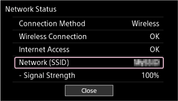 Pour vérifier le réseau SSID du HDD AUDIO PLAYER, sélectionnez [Paramètres] - [Paramètres Réseau] - [Afficher l'état du réseau] dans l'écran Accueil. Le réseau SSID du HDD AUDIO PLAYER s'affiche dans [Réseau (SSID)].