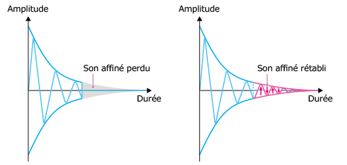 Les figures de gauche sont des images du son sans l'utilisation de la fonction DSEE, et celles de droite sont des images du son lors de l'utilisation de la fonction DSEE.
