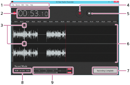 만일 녹음되고 있는 오디오의 신호 레벨이 0 dB (OVER 지점)에 도달하면 파형에서 정확히 OVER 지점 위에 표시(적색 점)가 모두 나타납니다. 동시에 신호 레벨 미터 바의 양쪽 또는 한쪽의 오른쪽 끝에