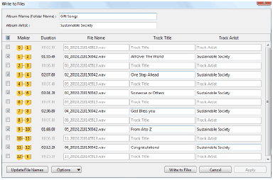 - ถ้าคุณใส่ชื่อแทร็คและชื่อศิลปินของแทร็ค และคลิก [ใช้] ข้อมูลที่คุณได้ป้อนจะถูกบันทึกไว้ชั่วคราว ฟังก์ชั่นนี้จะมีประโยชน์เมื่อคุณต้องการแก้ไขไฟล์ชั่วคราวทั้งหมดอีกครั้ง ถ้าจะแก้ไขไฟล์ชั่วคราวอีกครั้ง คลิก [ยกเลิก] ในหน้าต่างเขียนไปยังแฟ้มจากนั้น คุณสามารถใช้ชื่อแทร็คที่บันทึกไว้และชื่อศิลปินของแทร็คในหน้าต่างโหมดแก้ไข เพื่อการส่งออกได้อีกครั้ง