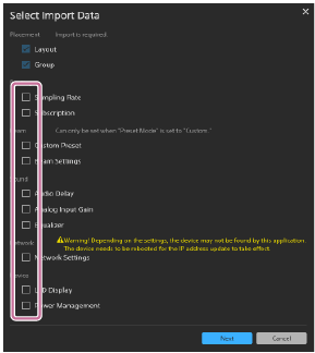「Layout」と「Group」は機器構成に必要な設定のため、必ず取り込まれます。