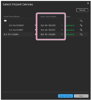「Select Import Devices」画面で、設定の取り込み先の機器名を選択する。