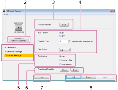 Sie können die Übertragungsmethode (manuell/automatisch), das Festplattenlaufwerk des HDD AUDIO PLAYER, auf das die Musikdateien übertragen werden, auswählen und den Übertragungsverlauf im Fenster Übertragungseinstellungen überprüfen.