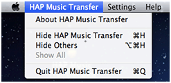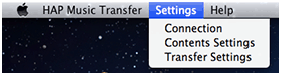 - Elija [HAP Music Transfer], [Settings] o [Help] en la barra de menús.