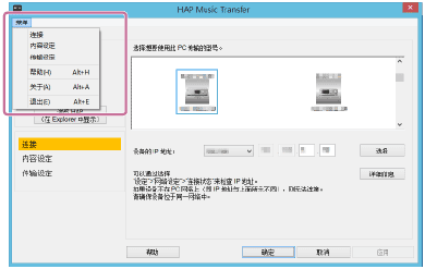 您可以利用系统菜单访问HAP Music Transfer帮助及查找HAP Music Transfer的软件版本。通过“连接”、“内容设定”或“传输设定”窗口可以选择系统菜单。