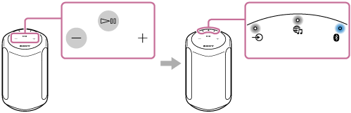 在扬声器打开的情况下,同时轻触并按住(播放/暂停)按钮和(音量-)按钮达4秒钟以上。当扬声器接受到这一指令时,BLUETOOTH、(音乐服务)和(AUDIO IN)指示灯会同时点亮。过一会儿,这三个指示灯将熄灭,表示初始化过程已完成,扬声器随即重新启动。