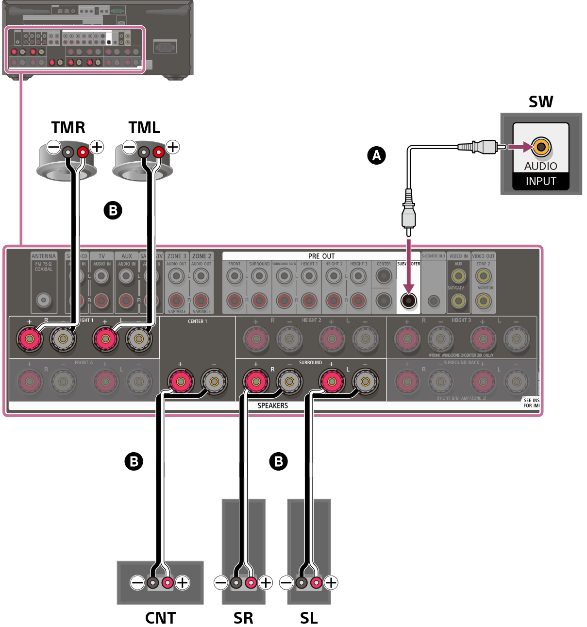 Conecte los altavoces envolventes izquierdo y derecho a los terminales SURROUND, el altavoz central al terminal CENTER 1 (STR-AZ7000ES/STR-AZ5000ES) o el terminal CENTER (STR-AZ3000ES), los altavoces intermedios superiores izquierdo y derecho a los terminales HEIGHT 1 (STR-AZ7000ES/STR-AZ5000ES) o a los terminales HEIGHT 1 (ZONE 2) (STR-AZ3000ES) y el altavoz potenciador de graves al terminal SUBWOOFER.