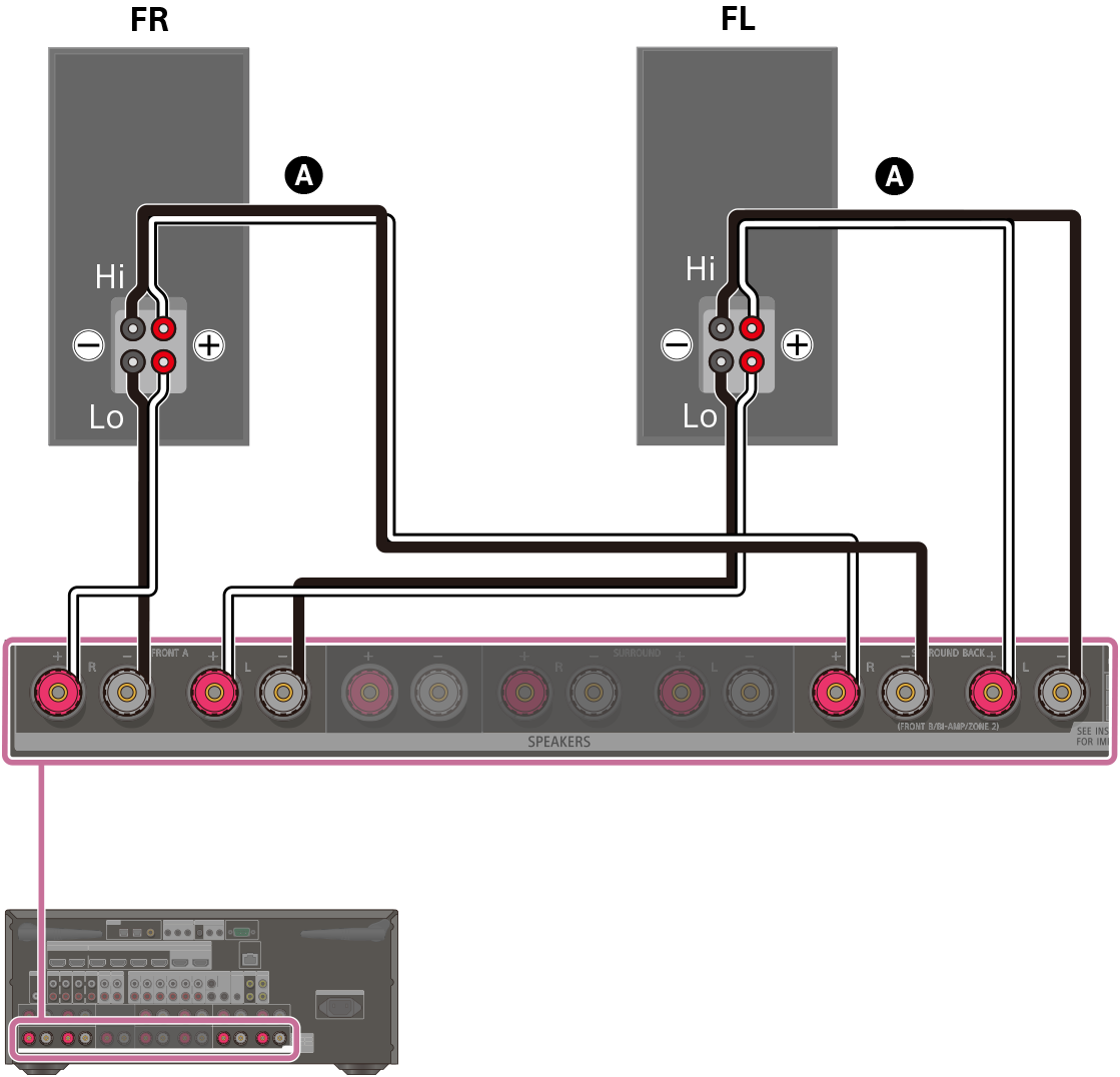 Conecte las tomas en el lado Lo (o Hi) de los altavoces delanteros a los terminales FRONT A y conecte las tomas en el lado Hi (o Lo) de los altavoces delanteros a los terminales SURROUND BACK (FRONT B/BI-AMP/ZONE 2) (para STR-AZ7000ES/STR-AZ5000ES) o a los terminales SURROUND BACK (HEIGHT 2/FRONT B/BI-AMP/ZONE 2) (para STR-AZ3000ES).