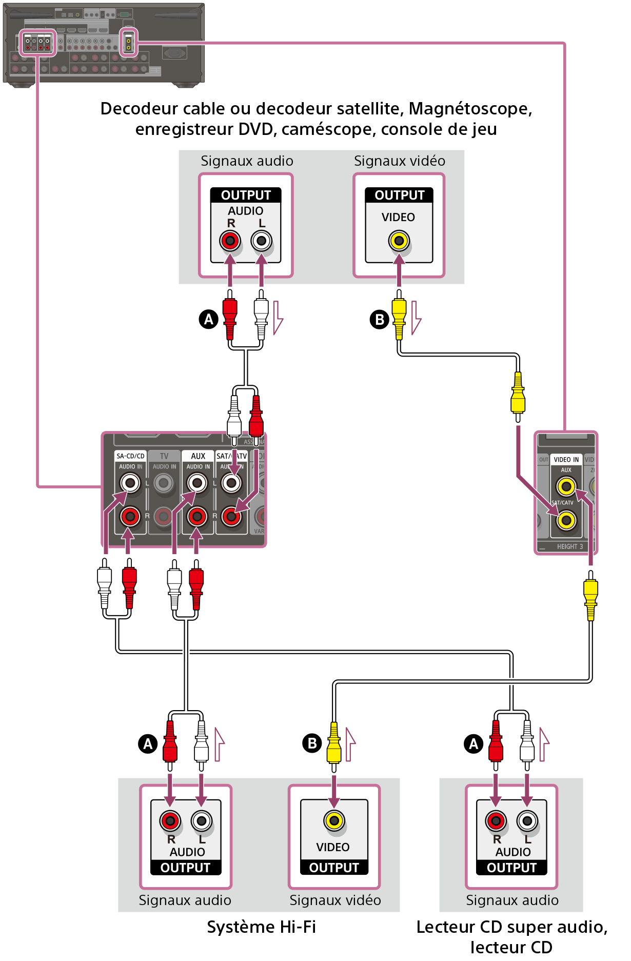 Raccordez chaque appareil à la prise vidéo et à la prise audio sur le panneau arrière de l’ampli-tuner.