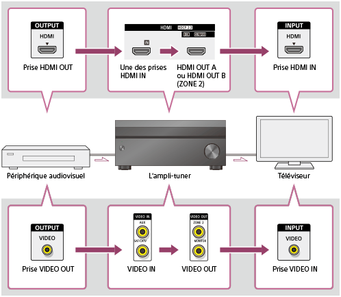 Les signaux vidéo numériques reçus par les prises HDMI IN de cet ampli-tuner sont reproduits à partir des prises HDMI OUT A ou HDMI OUT B (ZONE 2) uniquement. Les signaux vidéo analogiques reçus par les prises VIDEO IN sont reproduits à partir de la prise VIDEO OUT MONITOR ou de la prise VIDEO OUT ZONE 2 uniquement.