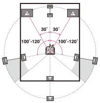 Coloque as caixas acústicas surround traseiras como mostra a ilustração abaixo. Os ângulos indicados por