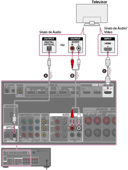 - Ao conectar um televisor ao receiver via os conectores TV IN do receiver, defina o conector de saída de som do televisor para [Fixed] se ele puder ser alternado entre [Fixed] ou [Variable].